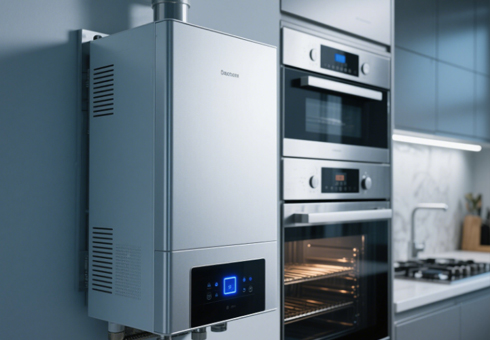 在待机状态下,打开冷水入口阀门或打开卫生热水出口阀门,调节面板上的绿色指示灯闪亮,冷水从节流器中的过滤网到节流器冷水出口时,通过传压管在压差阀处产生压差,使隔膜座向右移动,供暖阀门关闭,热水循环阀门打开,同时卫生热水优先开关闭合,风机转动,点火器打火,电磁阀打开,点火燃烧,烧热的水在循环水泵的压力下,经过板式热交换器与冷水进行隔离式换热,从卫生热水出口流出热水。